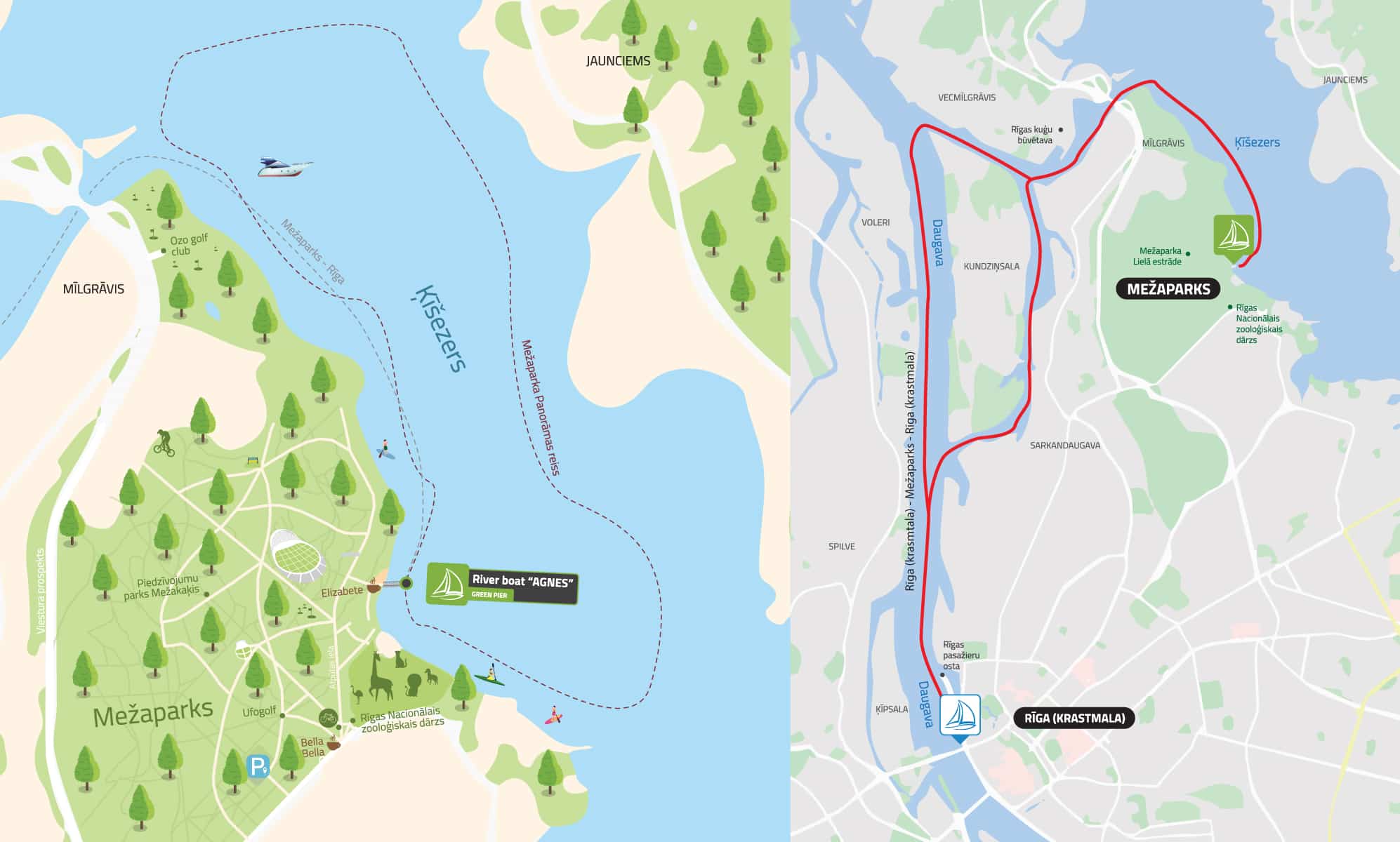 Upon arriving at the Mežaparks pier, passengers can visit the Ķīšezers beach, a nearby café, or take a short walk to the Mežaparks Great Bandstand and the Riga National Zoo.