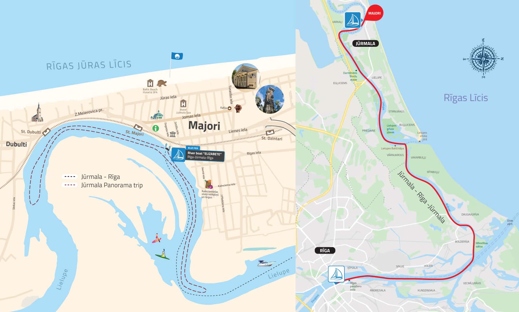 We offer a scenic route RIGA – JŪRMALA (MAJORI) – RIGA. During the trip, you’ll see the Riga Passenger Port, Riga Freeport, Ķīpsala, Andrejsala, Kundziņsala, Mangaļsala, and Bolderāja. Cruising along the Daugava past Love Island, the boat continues toward the Buļļupe River, which connects the Daugava with the Lielupe River. Along this section, you can enjoy peaceful natural landscapes, reed-lined bends, and a stone sculpture park.